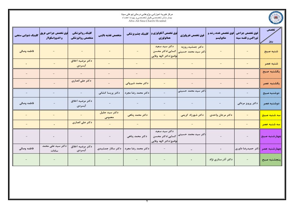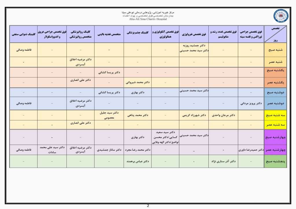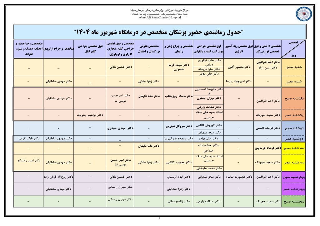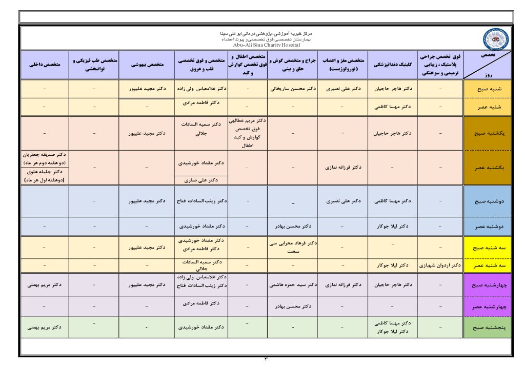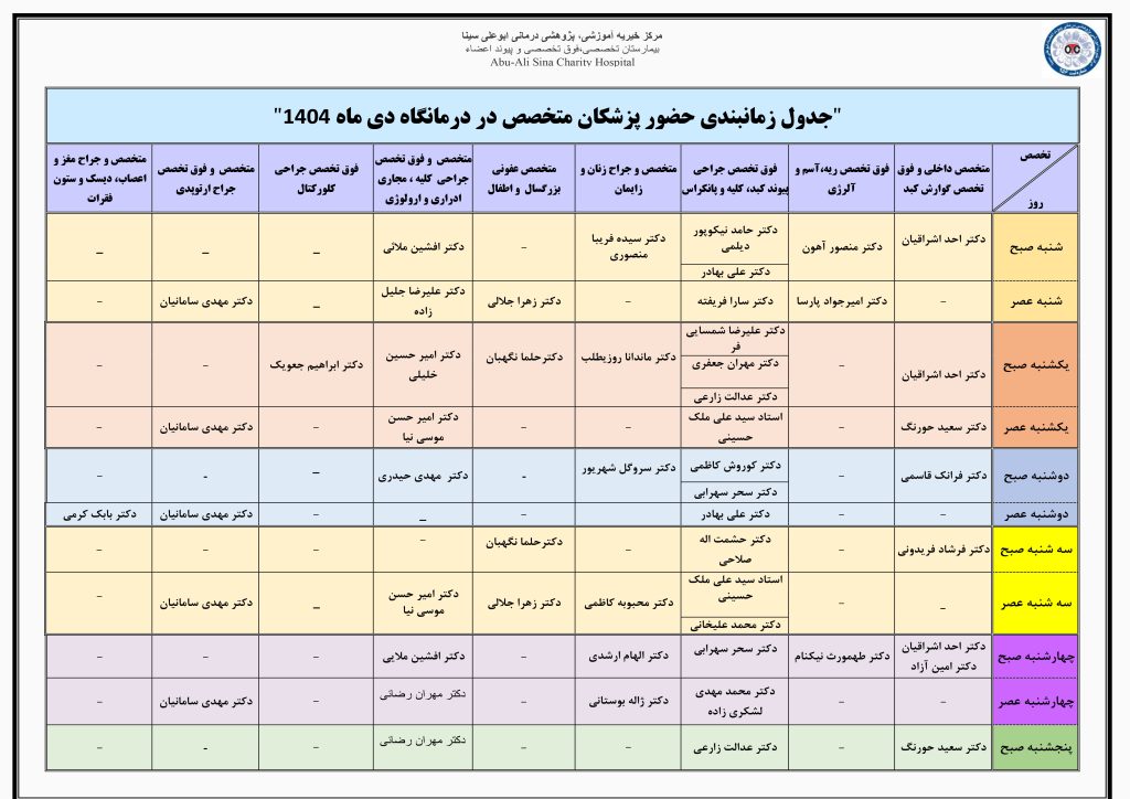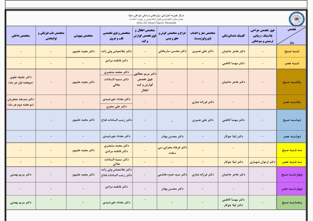 جدول زمانبندی حضور پزشکان متخصص در درمانگاه